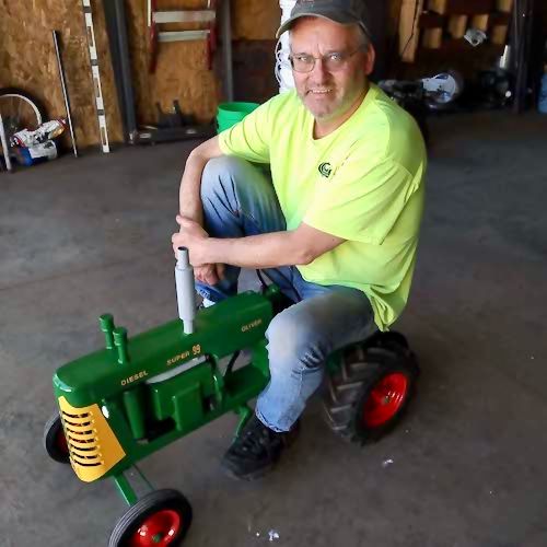 Bruce Krueger poses with one of his pedal tractors, an old Oliver model
