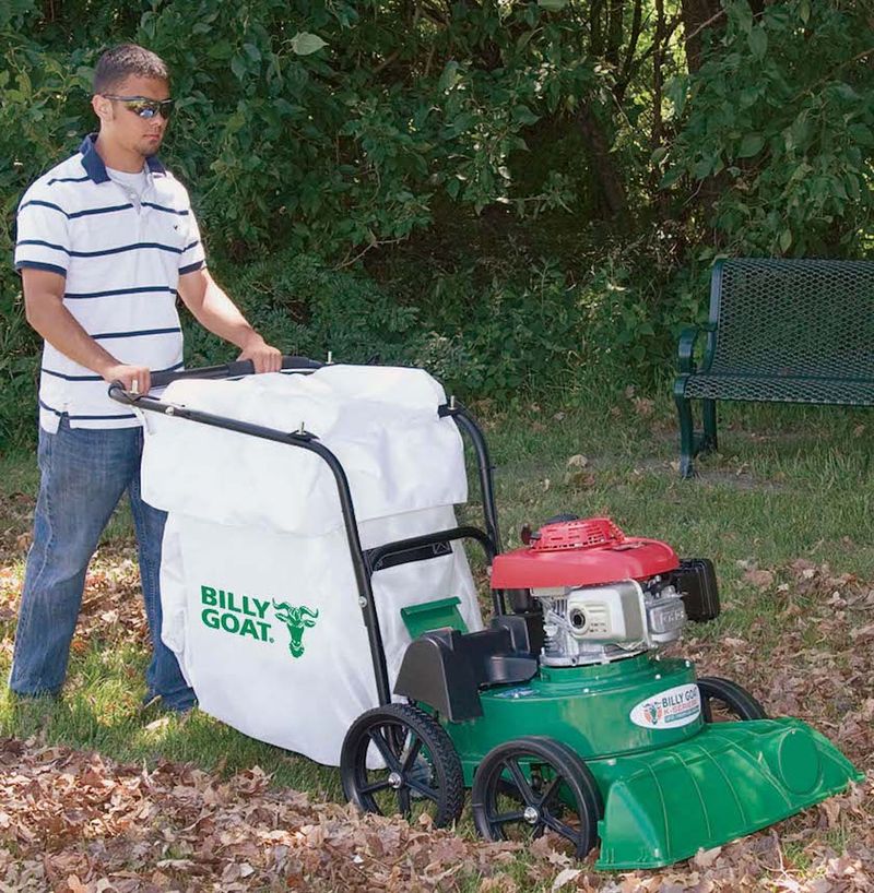 Billy Goat’s versatile 27” Lawn Vac has variable height adjust for hard surface or turf work. 12” tires on the push unit and rear wheel drive on the self-propelled unit make operation simple even on hilly terrain. Optimized nozzle improves suction and debris flow and handles hedge clippings with ease. Handle folds for off-season storage. Push or self-propelled models available.
