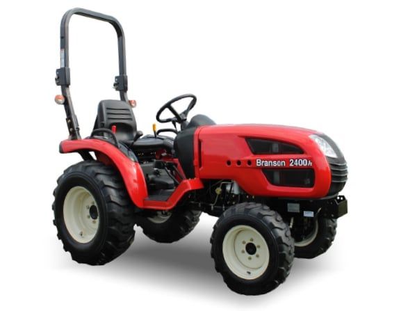 Branson Tractors designs their equipment with heavy-duty dependability in mind. The 2400h features cast iron housings, metal hood and fenders in powder-coated finish. Power comes from a 25 hp diesel engine though a two-range hydrostatic drive. Features include hydrostatic steering with two hydraulic pumps, wet disk brakes, and a choice of ag, turf, or industrial tires. A front loader with skid steer attach bucket option is available. A full line of accessories includes a headed cab, mid-mount mower, and front-mount snow blower.