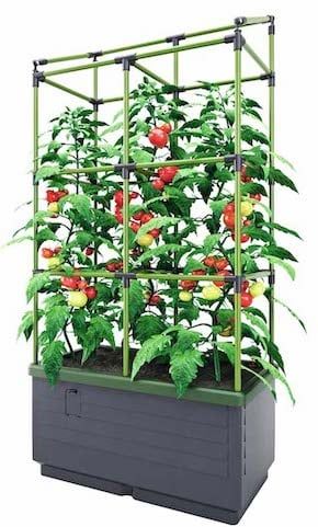 The two square feet of growing area in the City Jungle planter is large enough for two mature tomato plants or other large plants. Peppers, eggplant, squash, salad greens, herbs and even flowers also thrive in the self-watering City Jungle container. The water reservoir at the bottom of the planter holds 4.5 gallons, so plants can go for days without watering in most climates. A sturdy trellis (for tomatoes, cucumbers and other vining plants) can be added. A sturdy trellis (for tomatoes, cucumbers and other vining plants) can be added.