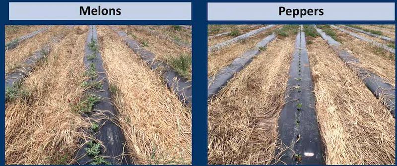 Cover crops were spread in two row middles in between plastic beds in early October. They were terminated in early April and rolled down with tractor tires. Four treatments did not receive glyphosate termination and was rolled down green. Watermelon and bell pepper plants were transplanted directly into the plastic bed in the middle mulch treatments.