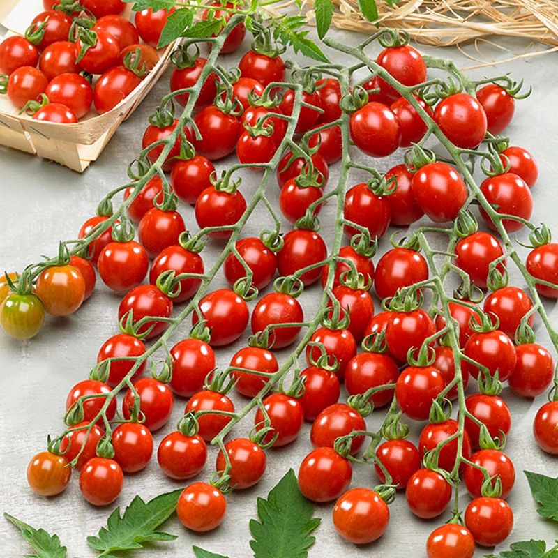 These cherry tomatoes are super sweet and flavorful. The fruits are described as having a honey-umami flavor. Tutti-FruttiTM Cherry Red Baby Hybrid Tomato are high-yielding, healthy plants which produce long trusses of fruits, even in cooler conditions, ensuring a good supply of glossy red, juicy tomatoes for snacking and salads. Indeterminate.
