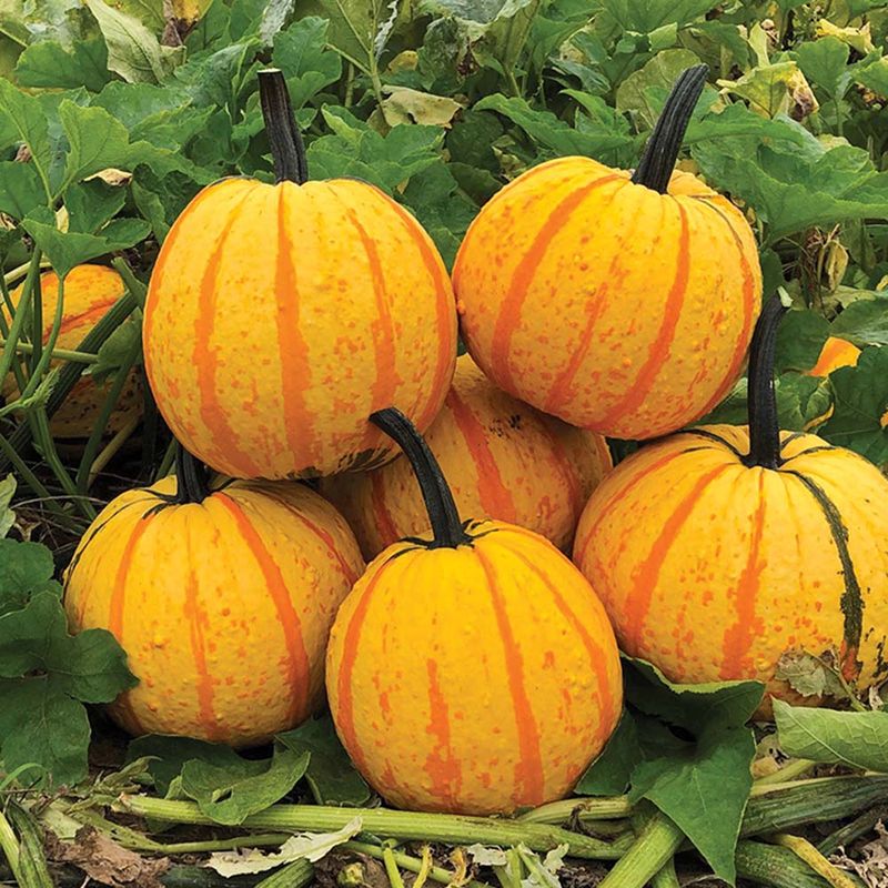 This new, novelty pumpkin is sure to light up your fall display. The rounded yellow orange, lightly warted fruits display green stripes which change to orange as they mature. Sporting incredibly dark handles and averaging 9 pounds, the Fireball Hybrid Pumpkin will add wonderful variety to pumpkin patches. It is a vigorous plant with an intermediate resistance to Powdery Mildew and Zucchini Yellow Mosaic Virus.