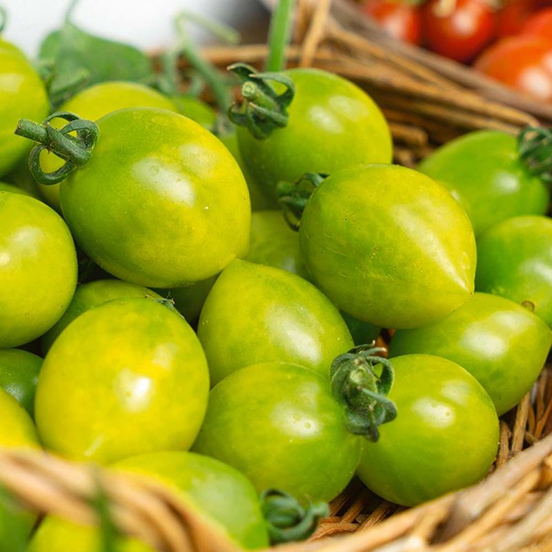 This cherry tomato is sweet and deliciously flavorful. The Grinch Dwarf Cherry Tomato is green to slightly yellow with 1 to 2 ounces of plum-shaped fruits which occasionally have a small tip on the blossom end. The plants have potato leaf foliage, grow up to 4' tall and should be supported. Great for containers and determinate in growth.