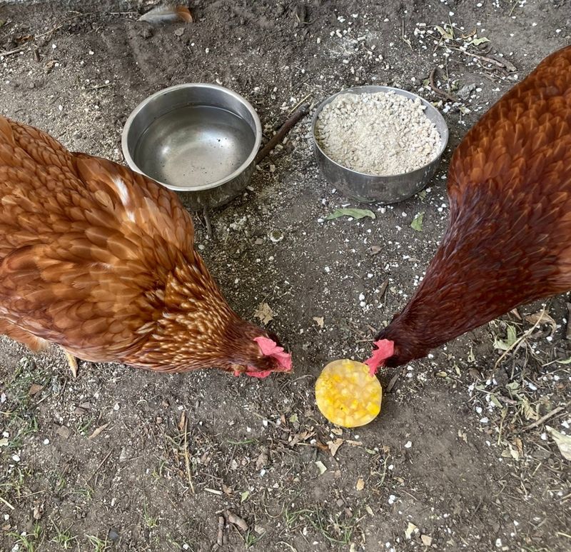 Besides providing a mister and fans, be sure your chickens have suitable areas with fine dust or sand where they can take their regular “dust baths.” These not only help them maintain their plumage but also help them regulate their body heat. Ice cubes put daily into their waterers ensure that the water will stay refreshingly cool. In addition, “popsicles” made by putting frozen fruit or vegetables in ice cube trays or muffin tins provide our feathery friends a fun and refreshing way to beat the heat. Chickens also love to have a shallow tray or dish of cold water to stand in and “cool their heels.”