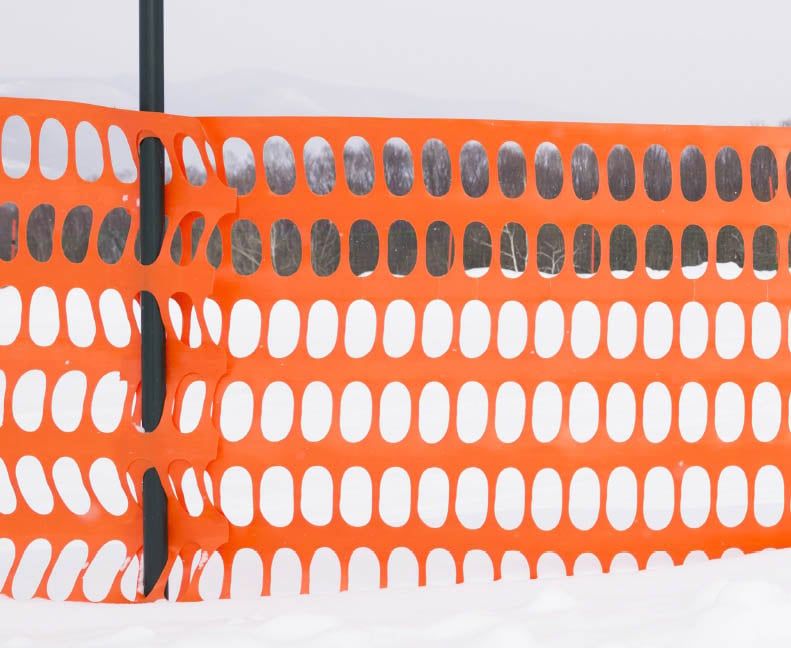 Temporary snow fences usually come in two flavors, wooden slat or polyethylene. Functionally, both are around 50 percent porosity, meaning they let half the wind and snow pass through, and half is retained and slowed.