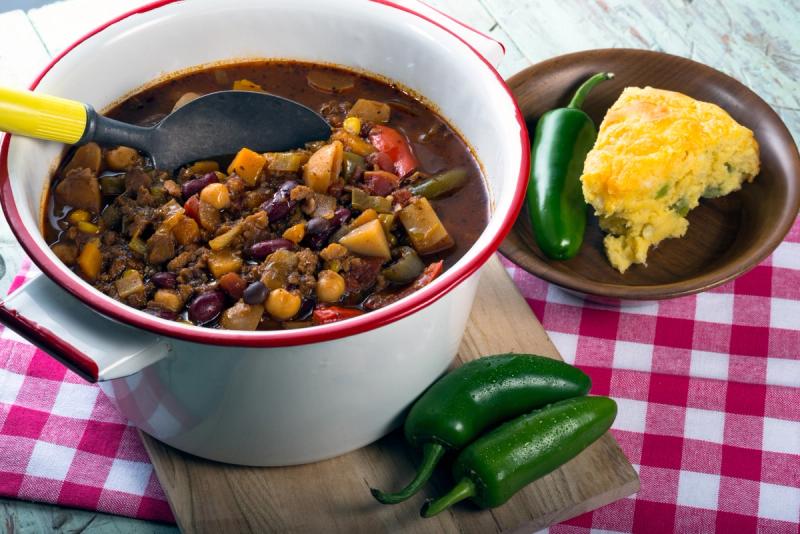 With this dish, we recommend pouring the chili over cornbread and topping it with raw onion and shredded sharp cheddar cheese, or your favorite chili fixings. The sweet heat is delish!