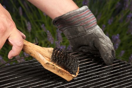 While the grates are out, hit them with a hose to loosen any food or debris. Place into a container of warm, soapy water to soak for up to 15 minutes. Take care to carefully remove debris with a stiff grill brush and rinse again. Let dry.