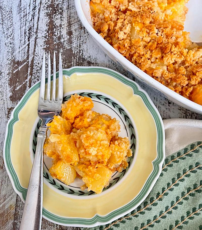 Pineapple Casserole is a classic in the South. It’s got a lot going on in your mouth: the sweetness of the pineapple, the savoriness of the cheese, some crunch from the layer of crackers, a cheery sunny color and a unifying undertone of BUTTER! Say no more.
